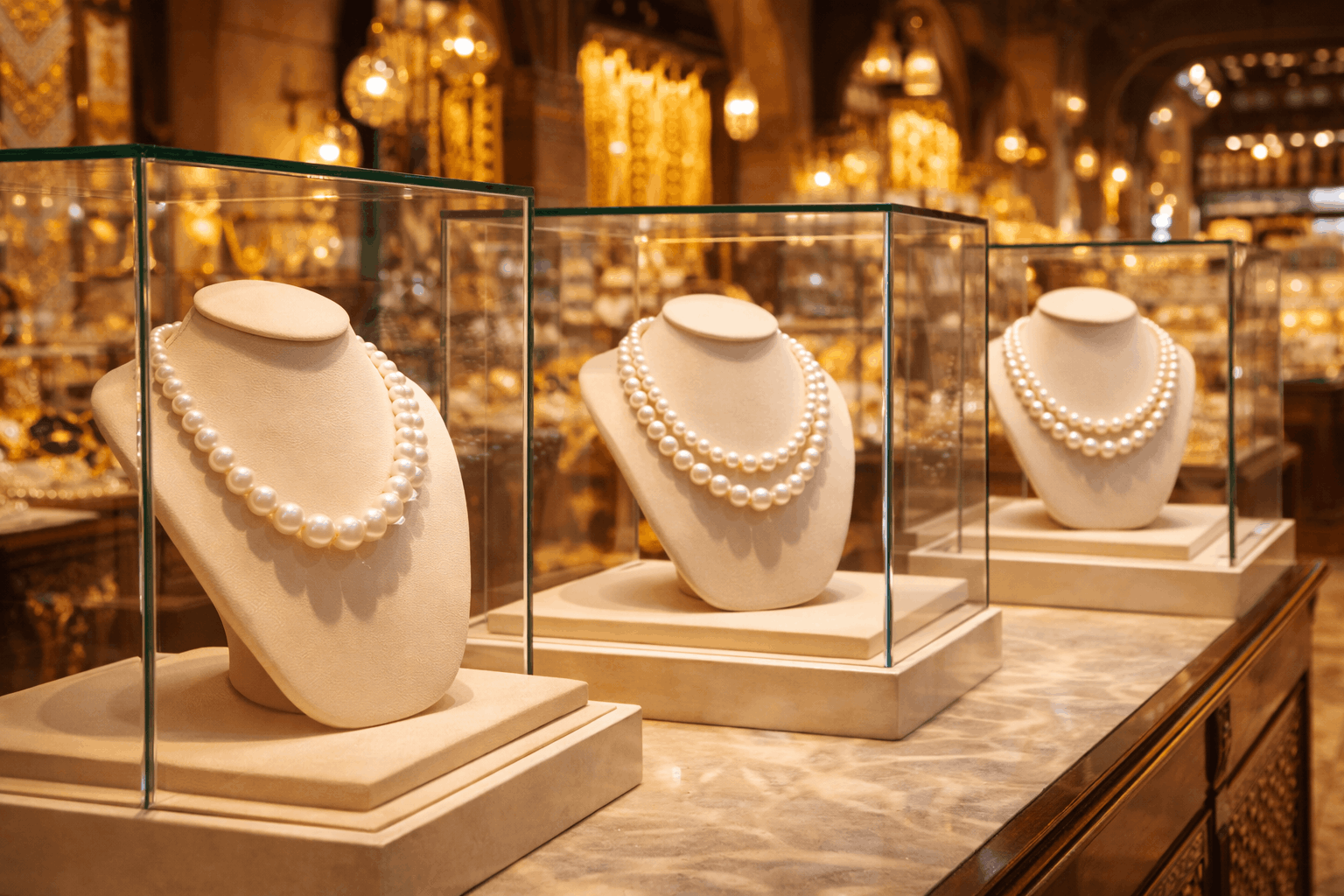 Luxus-Stücke gehen locker über AED 15.000. Große hochgradige South-Sea-Perlen. Hoher Goldanteil. Designer-Marken oder Maßanfertigungen. Das sind Investment-Stücke und Statussymbole. Das obere Segment bleibt in den VAE stark, weil Wohlstand Luxusausgaben trägt.