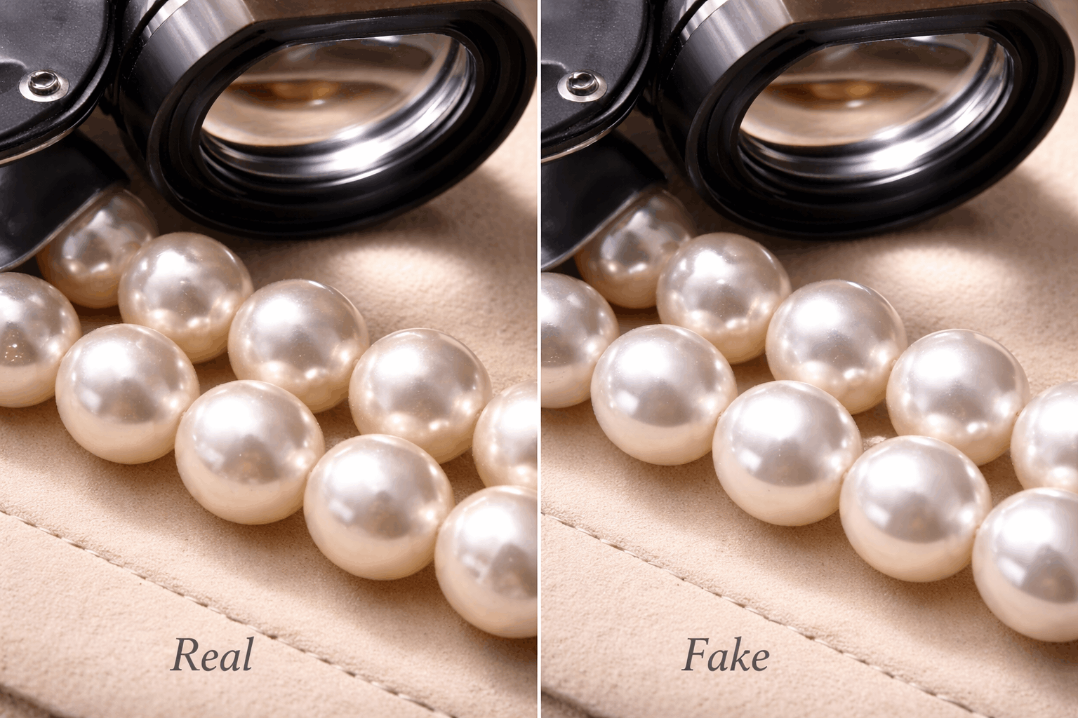 Der Zahn-Test funktioniert überraschend gut zur schnellen Prüfung. Reibe die Perle sanft an deinen Vorderzähnen. Echte Perlen fühlen sich leicht körnig an wegen der geschichteten Nacre-Struktur. Gefälschte Perlen fühlen sich glatt an wie Glas oder Plastik. Ja, es sieht komisch aus, aber es ist die schnellste Methode, um offensichtliche Fakes zu entlarven.